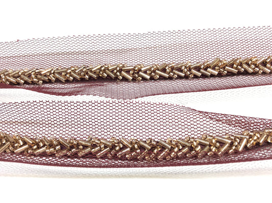 1 METRO PASSAMANERIA CORALLI TUBOLARI ORO BRONZO TULLE BORDEAUX CM 1