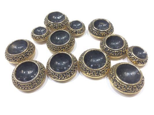 Set di 13 bottoni antichi vintage, oro e nero, diverse misure