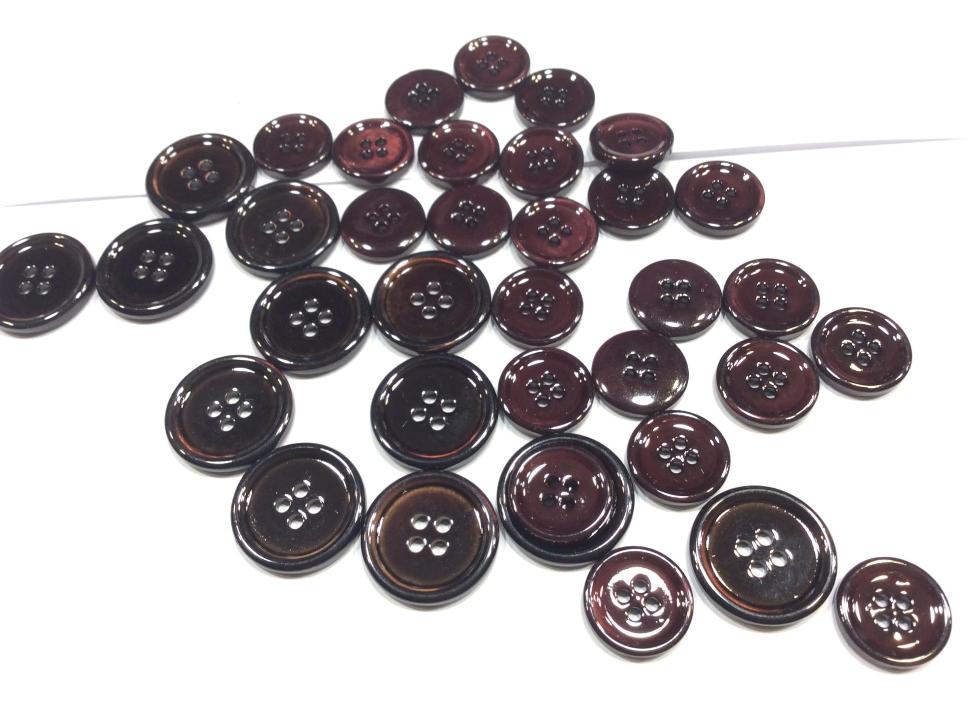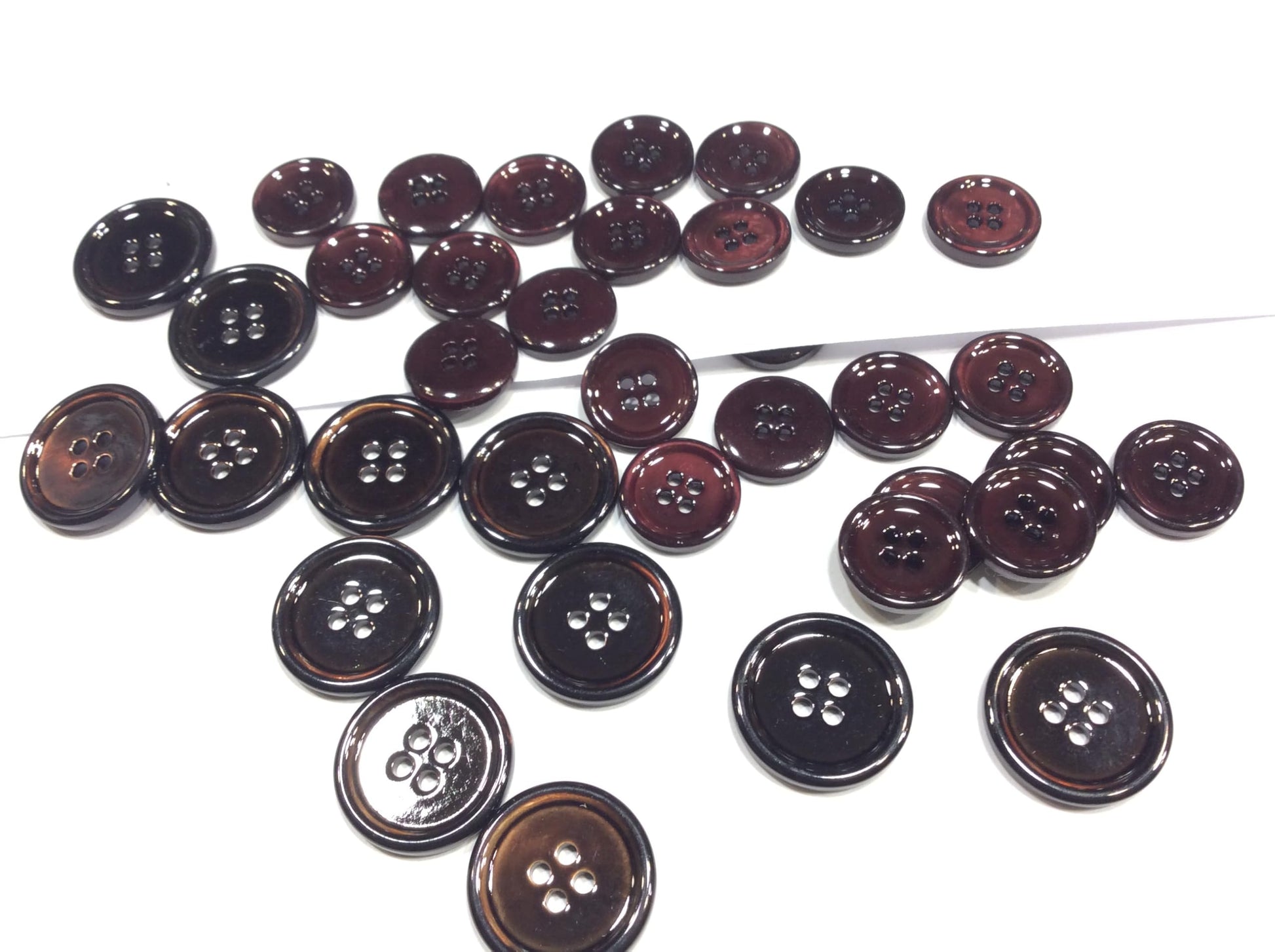 Elevate your garment craftsmanship with these exquisite sartorial buttons in rich dark brown and mahogany tones. This collection of 36 premium mother-of-pearl buttons showcases a classic four-hole design with a sophisticated high-gloss finish. Each button features a subtle depth and luminescence characteristic of fine mother-of-pearl, making them perfect for tailored suits, blazers, or high-end outerwear. The buttons come in varying deep brown shades, allowing for versatile matching with different fabrics and styles. Their substantial build and professional finish make them ideal for both traditional tailoring and contemporary fashion projects. These buttons represent the perfect blend of functionality and refined aesthetics, suitable for any sophisticated garment that demands attention to detail.